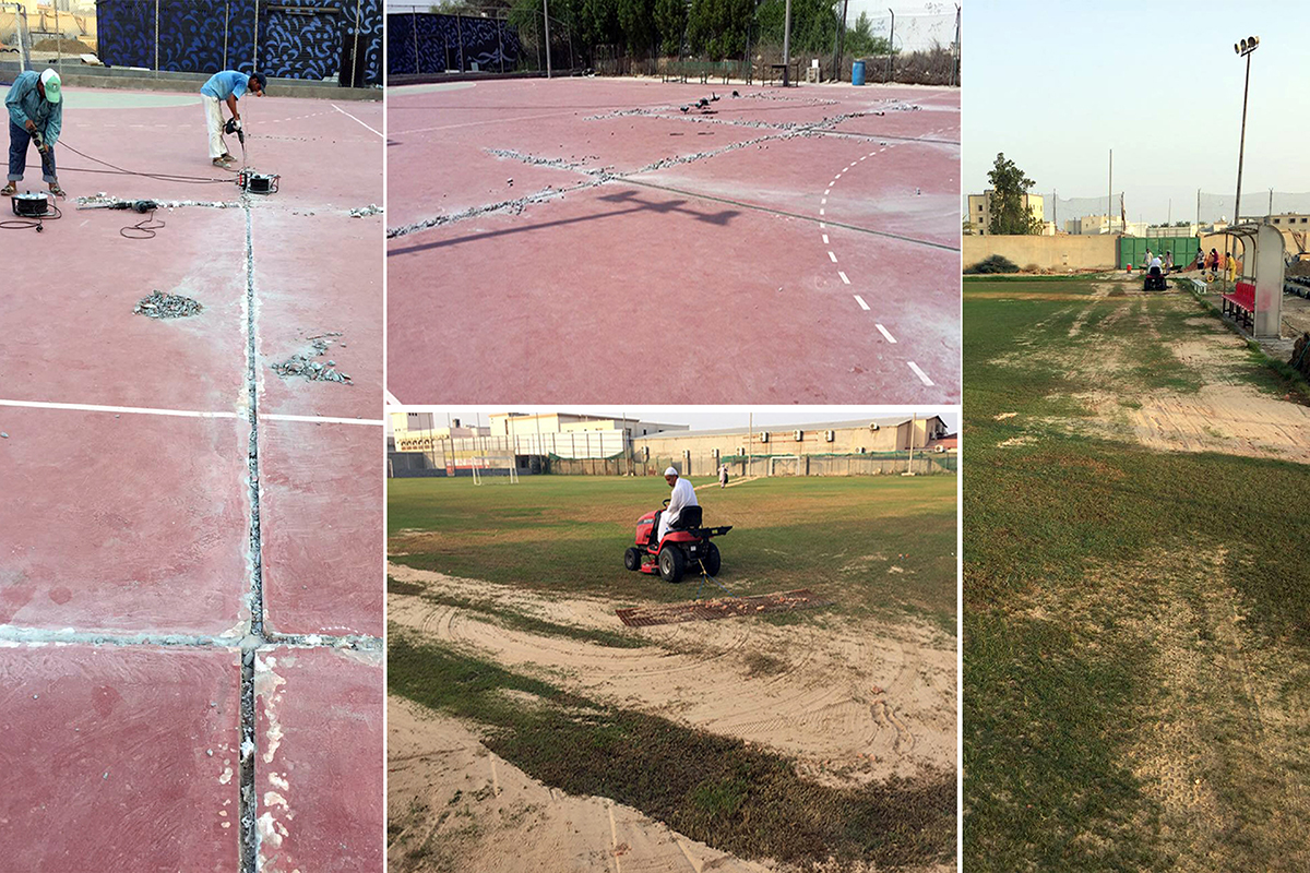 حيثُ تم إصلاح الإنارة لمعلب القدم، إضافة للبدء في تغير العشب في الأماكن التي تتطلب ذلك، والعمل مازال قائماً في تسوية الأرض بتغطية الأماكن الغير مستوية بالرمل المخلوط بالاسمدة.
