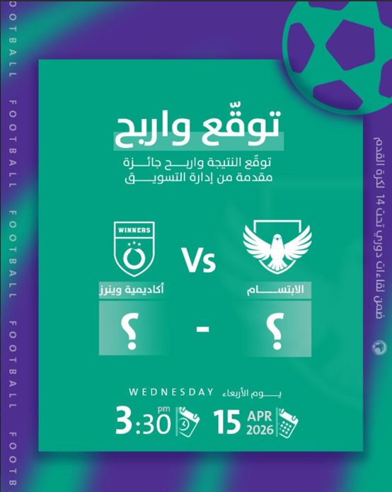 خمن واربح! المركز الإعلامي 13 / 4 / 2026م - 10:23 م توقّع نتيجة المباراة القادمة لكرة القدم وكن أحد الفائزين بجائزة مميزة مقدمة من إدارة التسويق 🤩🎉