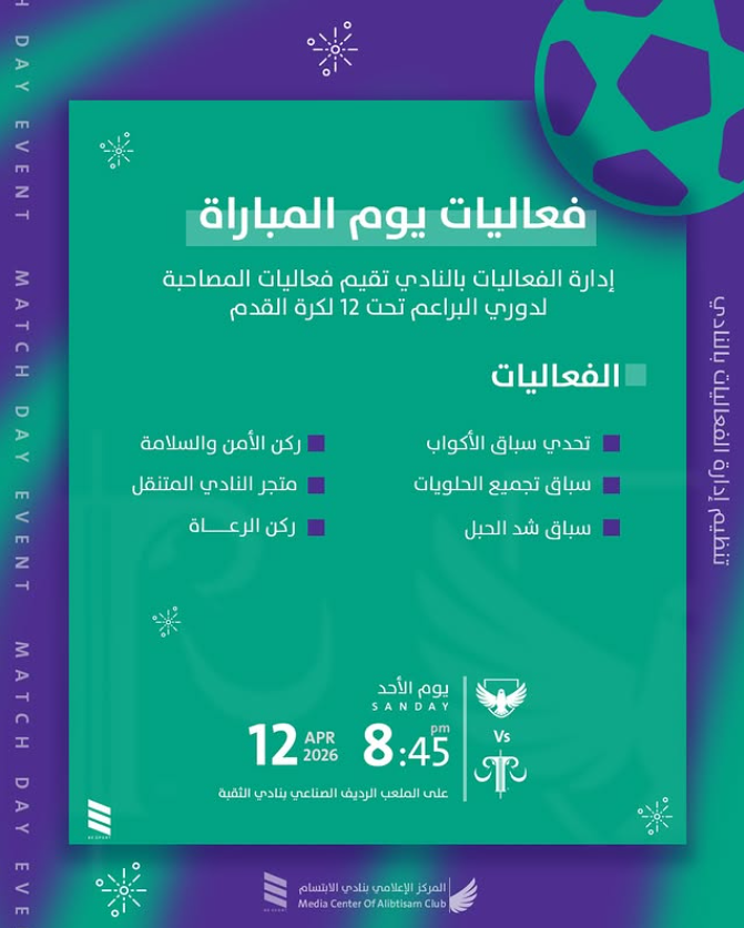 • الابتسام يواجه مضر الاثنين القادم ضمن لقاءات دوري فئة 15 لكرة القدم