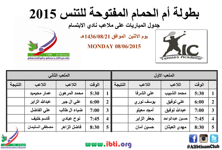 تتواصل اليوم الاثنين منافسات بطولة أم الحمام المفتوحة للتنس المقامة على ملاعب نادي الابتسام بيومها الخامس, وذلك بإقامة عشر مباريات في جميع فئات البطولة الأربع ( رجال أ - رجال ب - شباب تحت 18 سنة - ناشئين تحت 14 سنة ), وستكون المباريات على النحو التالي: